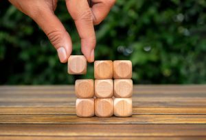 Last,Piece,Wood,Cube,Block,In,Hand,Putting,On,Wooden